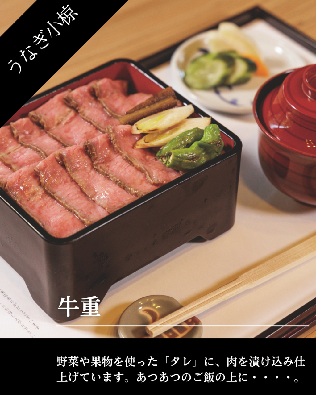 うなぎ小椋では、美味しいうな重をご案内させて頂いておりますが、うな重だけではありません!!おすすめは、『牛重』野菜や、果物を使った「タレ」に肉を漬け込み、あぶって調理しています。あつあつのご飯と食べる、『牛重』。ぜひ、ご賞味ください。●木 60g(香の物、お吸物付き) 2,500円●上林 90g(香の物、お吸物付き) 3,500円●特森 120g(香の物、お吸物付き) 4,500円※それぞれテイクアウト可※TEL:089-917-8080ご来店お待ちしております。 -