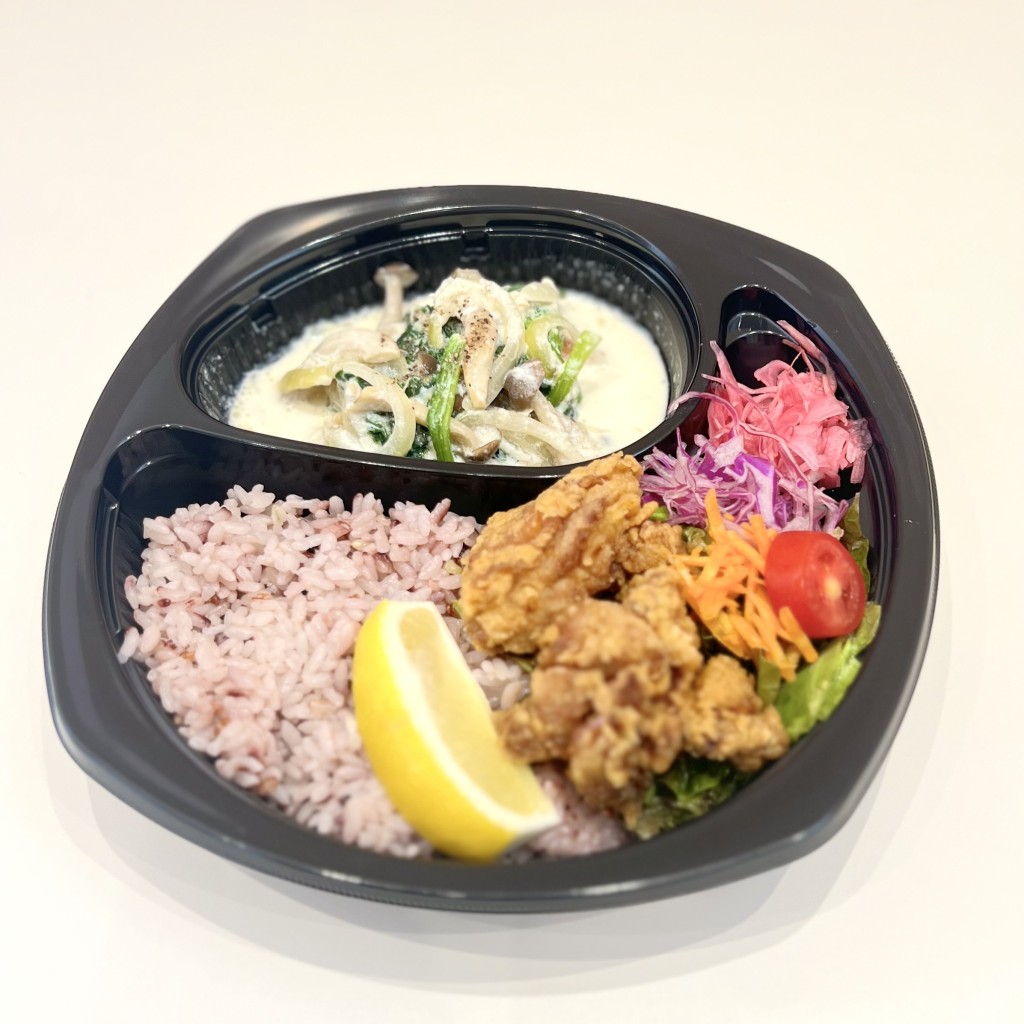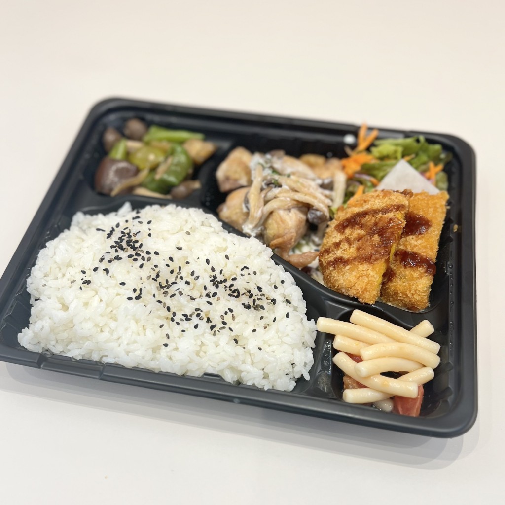 唐揚げ、ハンバーグ、白身魚のフライ、コロッケ、ポテト、彩り野菜