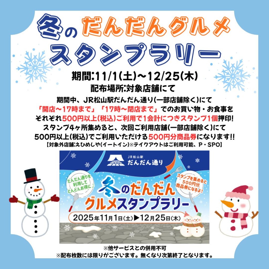 期間中、JR松山駅だんだん通り(一部店舗除く)にて「開店~17時まで」「17時~閉店まで」でのお買い物・お食事をそれぞれ500円以上(税込)ご利用で1会計につきスタンプ1個押印!