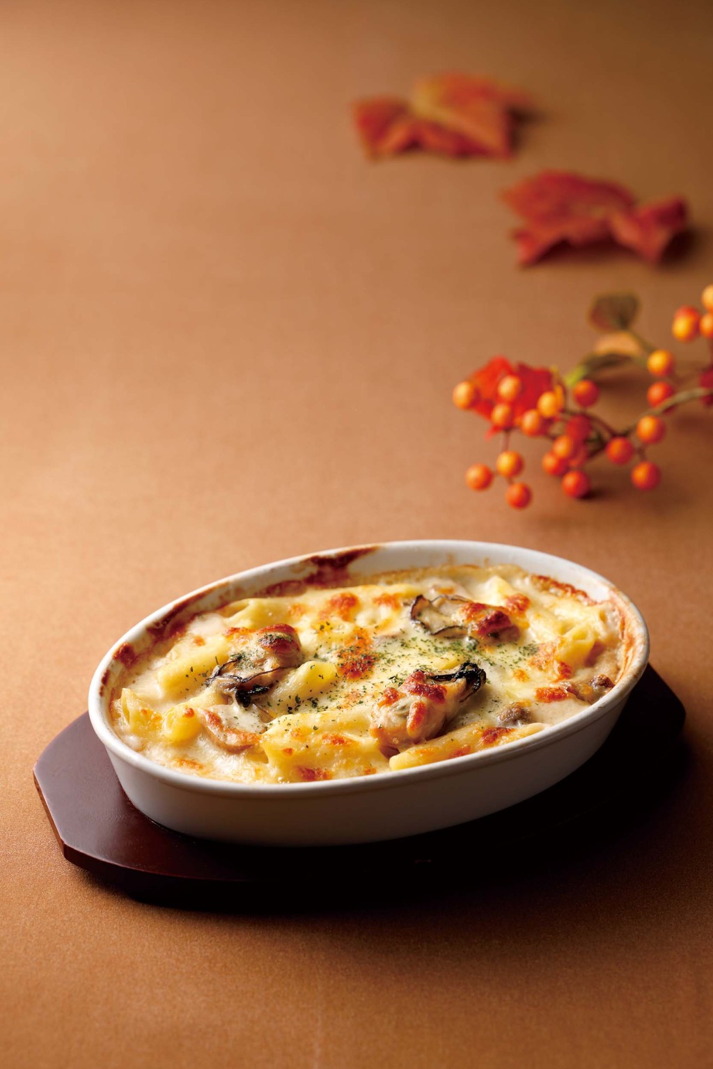 ぷりぷりの牡蠣と3種類のきのこが贅沢に香る、ペンネを使った熱々グラタン。