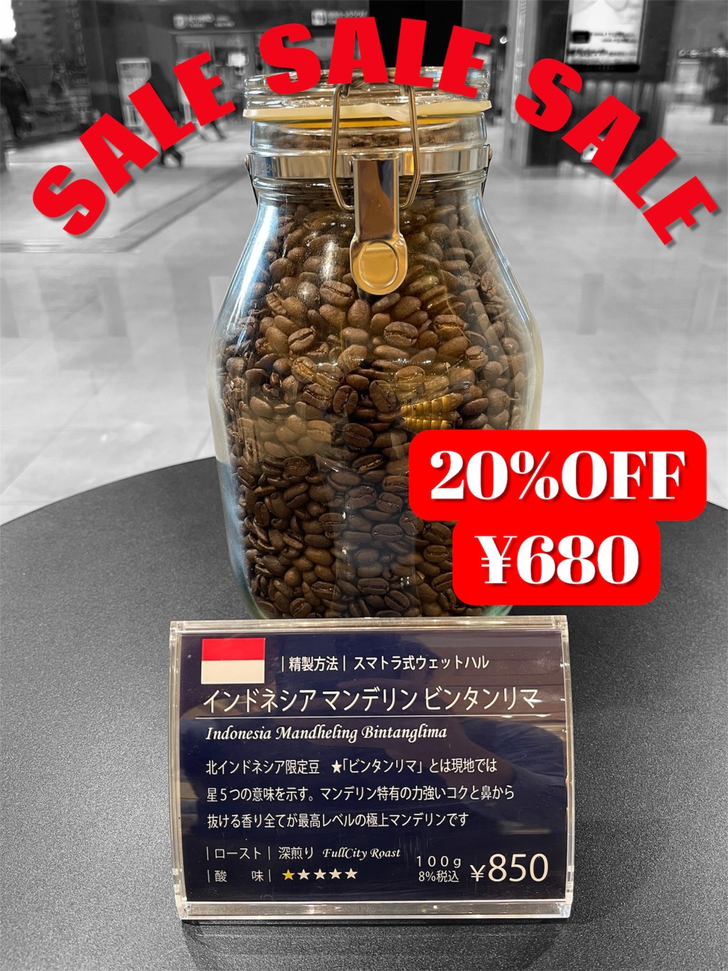 重厚なコクとマンデリンならではの華やかな発酵の香りが特徴。ビンタンリマとは現地用語で星5つという意味があり、最高品質のマンデリンです。更に毎月オススメ珈琲豆は20%OFFで販売しますのでこの機会にぜひお試し下さい。