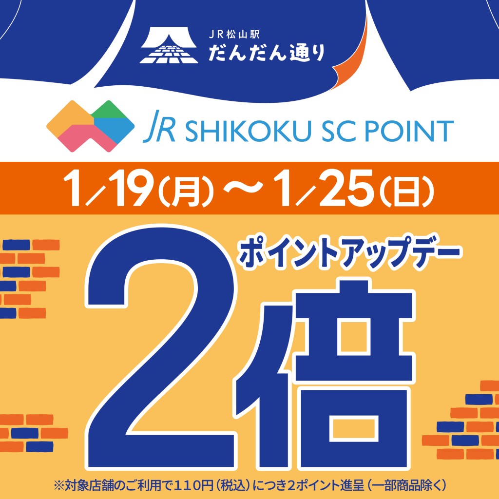 1月19日(月)~1月25日(日)の1週間、JR松山駅だんだん通りにてJR四国SCポイント2倍デーを開催します!!