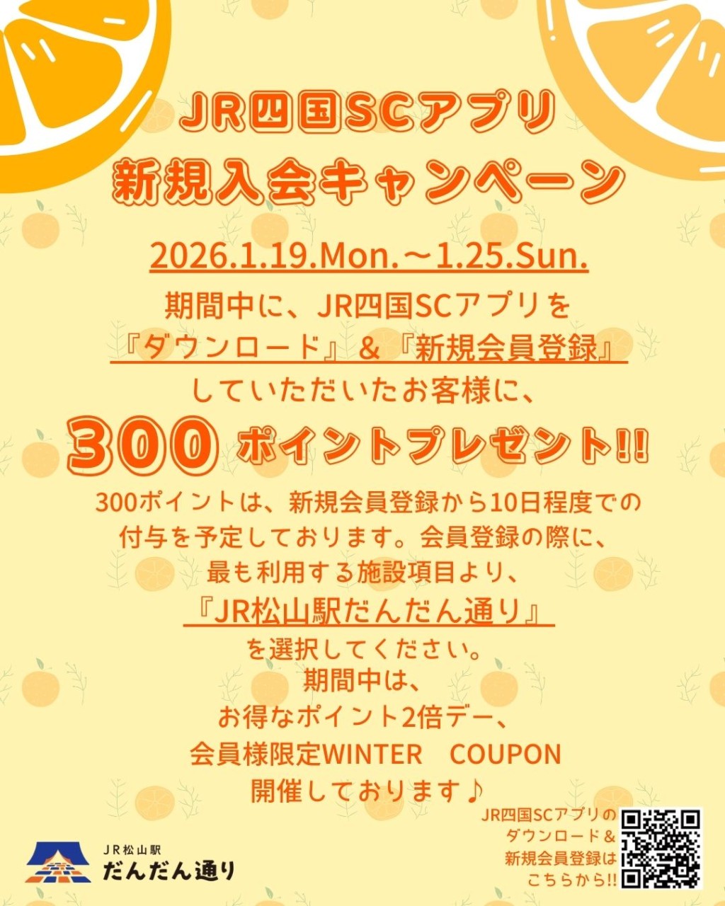 期間中、JR四国SCアプリをダウンロード&新規会員登録していただくとお買物・お食事で使える300ポイントをプレゼント!!✨