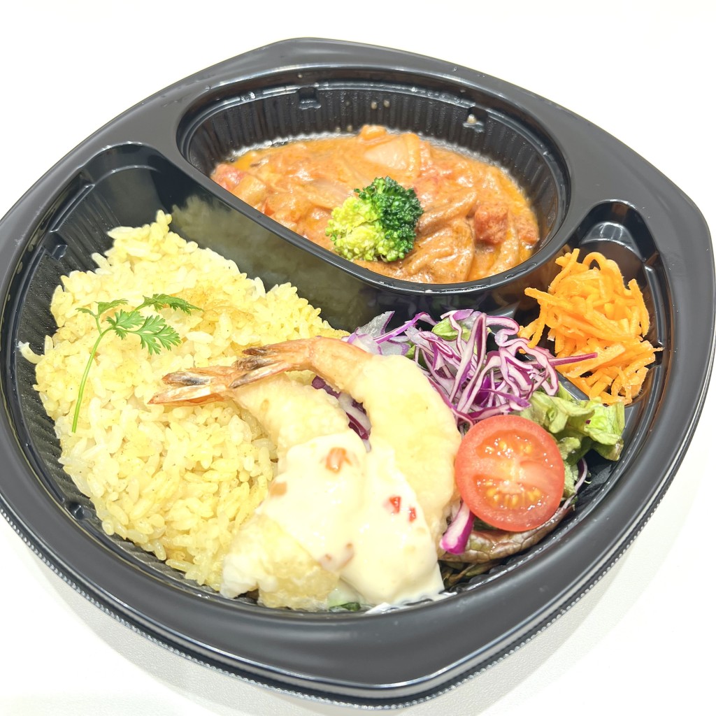 ハッシュドビーフ、ターメリックライス、エビマヨ