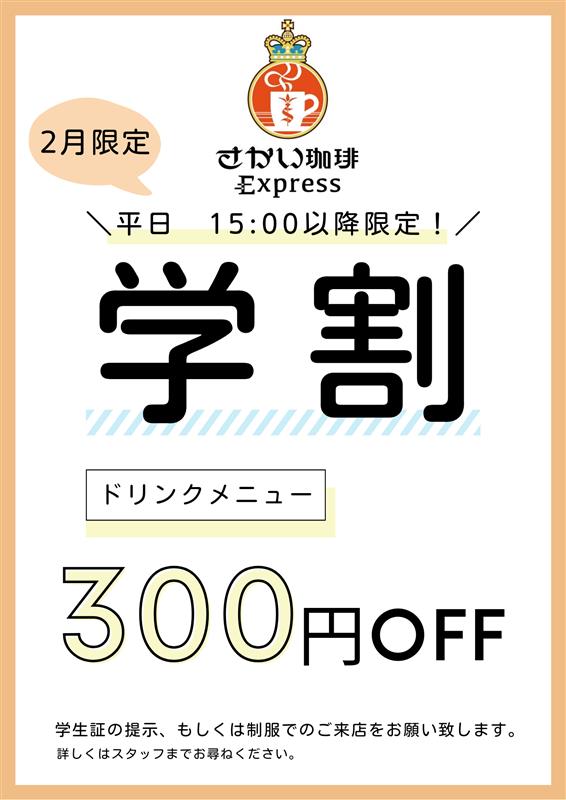 さかい珈琲Expressでは、2月限定で学割キャンペーンを開催しておりますお♪