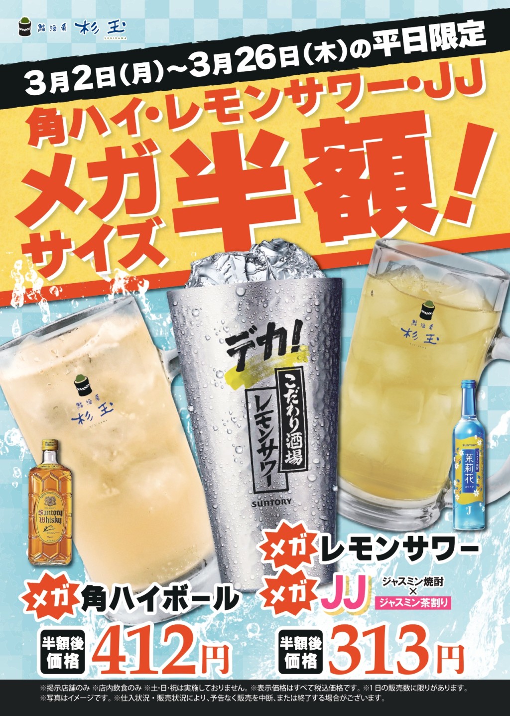 杉玉では現在、平日限定メガサイズドリンク半額キャンペーンを3月26日(木)まで開催しております!!✨